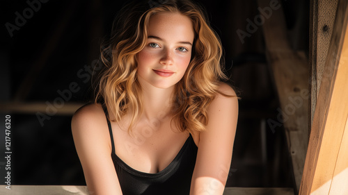 A young woman with long, wavy blonde hair sits indoors. She is wearing a dark-colored low-cut top and her expression is thoughtful and attractive.