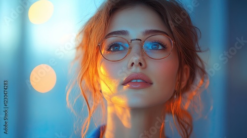 A young woman with red hair and glasses looks thoughtfully at something out of frame, bathed in warm light.