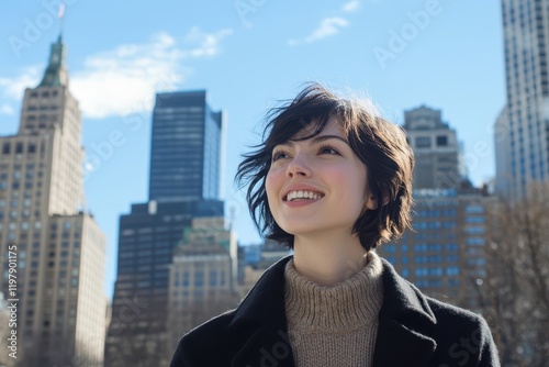portrait, person, confidence, horizontal, one person, short hair, young adult, happiness, smiling, beautiful woman, individuality, photo, fashionable, looking, female, woman, standing, color image, copy space, studio shot, brown hair, front view, contemplation, elegance, femininity, japan, black hair, real people, carefree, colours, defocused, eye, front, glamour, head shot, illuminated, image, lady, look
