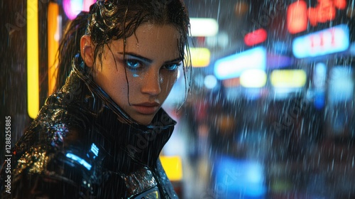 woman, rain, city, neon, night, urban, portrait, blue, light, street, beauty, fashion, wet, cool, atmosphere, emotion, style, culture, modern, nightlife, photo, character, scene, dramatic, high-coloured, vibrant, trendy, cinematic, coolness, edgy, striking, alluring, intensity, gaze, urbanity, dynamic, stylish, closeup, mood, ambience, futuristic, allure, confidence, colours, energy, visual