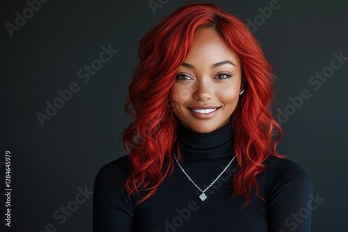 A young woman with vibrant red hair and freckles smiles confidently, wearing a black turtleneck and delicate necklace.