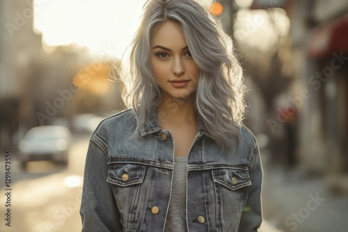 grey hair, wavy hair, woman, missy, girl, sunlight, street, city, urban, fashion, style, portrait, model, pretty, beautiful, attractive, confident, casual attire, cool, trendy, blond, denim, jean, jacket, outdoors, natural light, sun, light, shadow, bokeh, background, blur, sharpened, depth of field, expression, face, eye, make-up, hair, coiffure, pose, standing