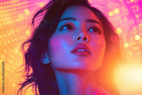 A young woman's portrait, bathed in vibrant neon lights, evokes a feeling of mystery and allure.