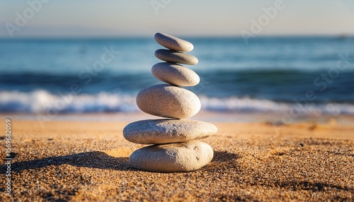 a zen symbol in the form of a pyramid of stones resting on sandy ground representing harmony and balance the image also includes the serene backdrop of the ocean with a closeup of a tower of sea pebb