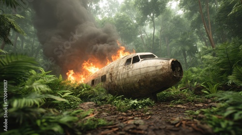 aeroplane, wreckage, jungle, vegetation, smoke, fire, wilderness, abandoned, landscape, nature, adventure, disaster, survival, environment, exploration, ruined, travel, forest, emergency, crash, scenic, dramatic, scene, photo, heat, danger, foliage, tropical, isolation, shadow, raw, terrain, unexpected, mystery, eerie, atmosphere, wild, tranquil, visualisation, transport, decay, challenge, serenity, untouched, remote, exotic