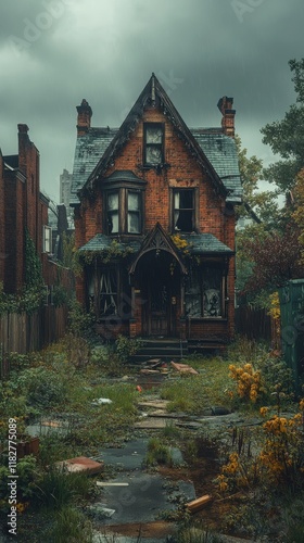 Abandoned brick house with overgrown yard under cloudy sky, for real estate.