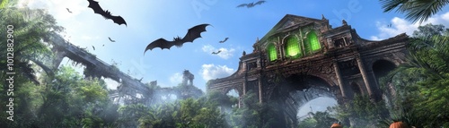 abandon, church, pumpkin, glow, window, eerie, green, light, flicker, fractured, bat, fly, moonlight, skittish, haunt, mysterious, build, halloween, scarey, darkness, desert, house, jack, lantern, chapels, horror, place, structure, atmosphere, location, orange, ambience, creepy, architecture, property, edifice, ruin, cathedral, sanctuary, temple, luxury home, greenish, manor, dwell, scene