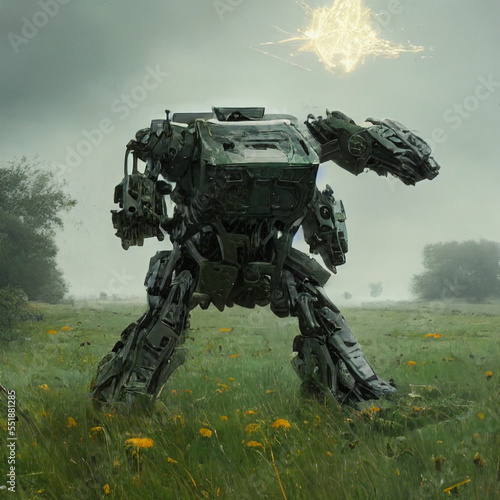 generative, ai, biped, abandoned, wreck, scrap, military, illustration, field, reclaim, offline, machine, spent, old, battle, damage, rust-eaten, landscape, cinematic, sombre, lighting, metal, large, alien, ominous