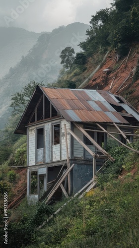 Abandoned House on a Steep Mountain Slope Surrounded by Forest