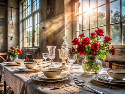 abandoned, luxury home, table setting, rose, red rose, white rose, decay, elegance, forgotten, grandeur, still life, photo, interior, room, building, derelict, vintage, antique, beautiful, flower, table, tableware, glassware, luxury, opulent, romantic, mysterious, moody, atmospheric, light, shadow, contrast, texture, detail, history, past, time, deserted, exploration, discovery, old house, elegant, sophisticated