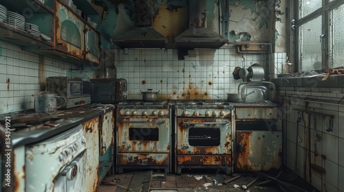 Abandoned old kitchen in a disused bunker, rusty appliances, decaying walls, and remnants of a bygone era, eerie and desolate