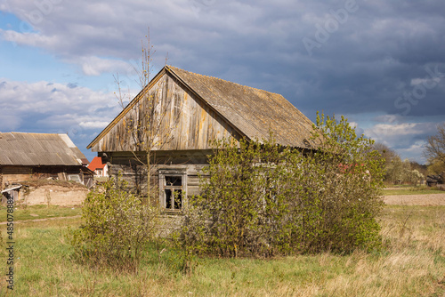 Abandoned old wooden house among the trees. Rural spring landscape.
