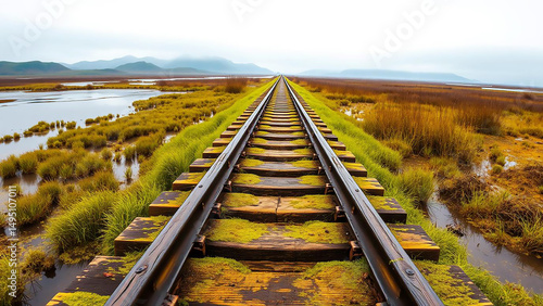 Abandoned Railway Tracks in Marshy Wetlands with Mountains in Distance