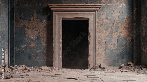 Abandoned Room with Open Doorway and Crumbling Walls and Floor