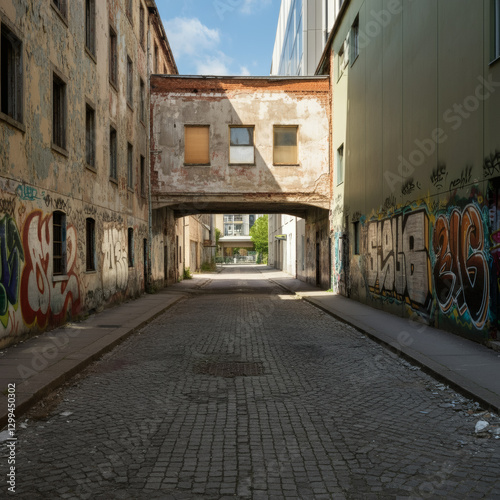 Abandoned urban building with graffiti-covered walls, decayed architecture, neglected infrastructure, street art in empty alley