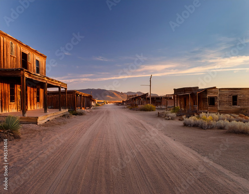 Abandoned western town with rustic wooden facades and empty dirt roads at sunset