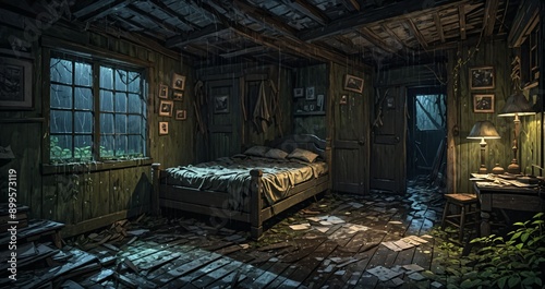 abandoned wooden cabin bedroom interior in the woods on a rainy evening day night. ransacked wood log lodge overgrown cottage in the forest rain.