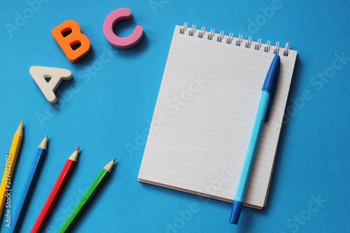 ABC-the first letters of the English alphabet on a blue background. Notebook and pen. Empty space for text. Learn foreign languages.