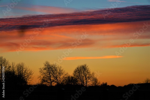 sunset, dusk, cloud, countryside, sunset, heaven, orange, nature, sun, red, evening, home, tree, silhouette, pretty, blue, horizon, twig, spring, heat, liberty, winter, course, light, mood