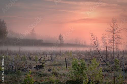 spider's web, dawn, destination, fog, grass, june, landscape, light, mist, moss, outdoors, perm, scenery, shrub, snag, summer, sunrise, swamp, travel, tree, urals