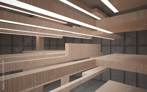 Abstract concrete and wood interior multilevel public space with neon lighting. 3D illustration and rendering.