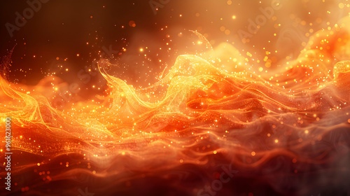 Abstract 3D Background with Orange and Gold Waves, Glowing Particles, and Bokeh Lights