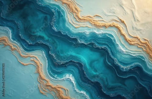 Abstract aerial view water flowing. Turquoise blue color palette. River, ocean, sea, wave flowing, sandy coast, top down perspective, painting style. Digital art for travel, eco, tourism industry.