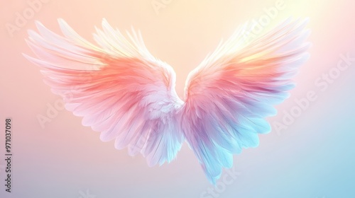 Abstract angel wings with detailed feathers glowing in radiant light, suspended in midair against a soft pastel gradient
