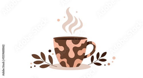 hot drink, cup, abstract, modern, animal, print, pattern, brown, steam, leaf, decor, warm, cosy, morning, beverage, drink, illustration, flat, design, decorative, creative, trendy, element, stylish, artistic, vector, background, template, isolated, concept