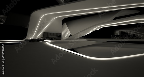 Abstract architectural black and white interior of a modern villa with neon lighting. 3D illustration and rendering.