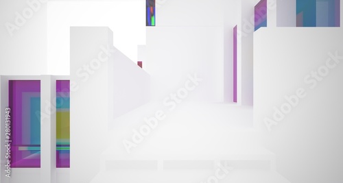 Abstract architectural white and glass gradient color interior of a minimalist house with large windows.. 3D illustration and rendering.
