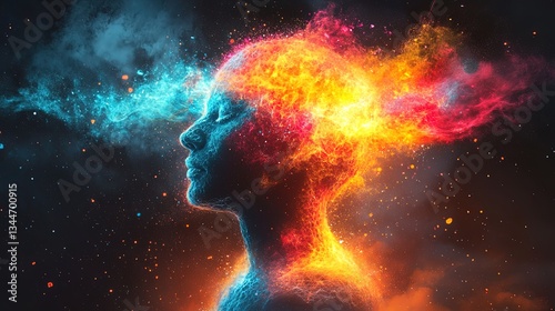 Abstract art of human silhouette with colorful fractals around head, symbolizing creative thoughts