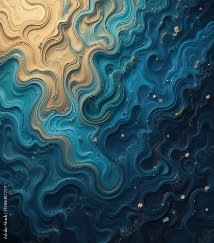 Abstract art of liquid swirling in blues and creams Decorative elements like gold flakes add dimension to fluid organic flow