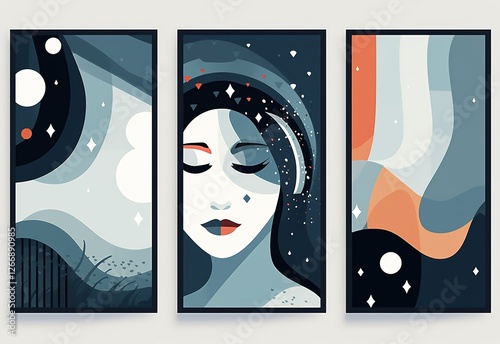 Abstract art posters wall art decor set, happy cheerful minimalist design, abstract face artful design in blue pink color