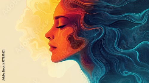 abstract, artistic, profile, woman, colours, portrait, vibrant, creative, illustration, wave, line, detailed, face, warm, cool, contrast, gradient, contemporary, digital, modern, silhouette, flowing, expressive, peaceful, serene, sideview, harmony, imaginative, colourful, texture, painting, elegant, beauty, stylised, design, intricate, swirl, art, feminine, fluid, aesthetic, imagination, dreamy, bright, bold, optical, atmospheric