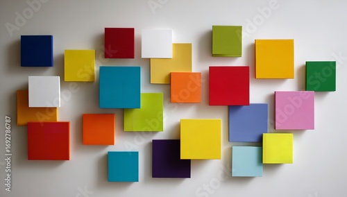 Abstract artistic wall with colorful paper squares arranged in a geometric pattern, creative design inspiration for artwork, painting palette, and modern interior decoration concept
