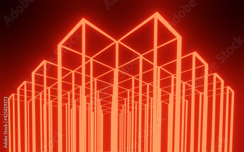 Abstract Background 3D rendering Red tron with stripes of neon lights and reflections. Sci-FI Futuristic architecture background Chaotic Blue Neon Lights laser with rays and lines.