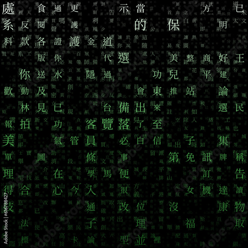 Abstract Background. Random Characters of Chinese Traditional Alphabet. Gradient matrix pattern. Green color theme backgrounds. Tileable horizontally. Trendy vector illustration.