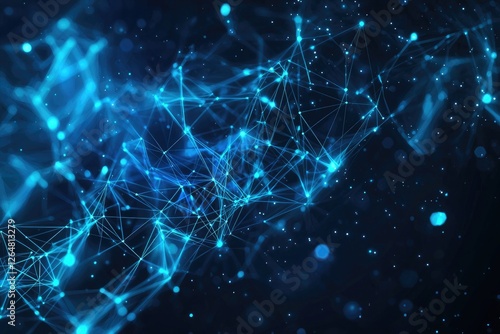 Abstract background with a blue, glowing, low-poly polygonal network connection and triangle shapes on a dark background, representing technology, science or digital concept design