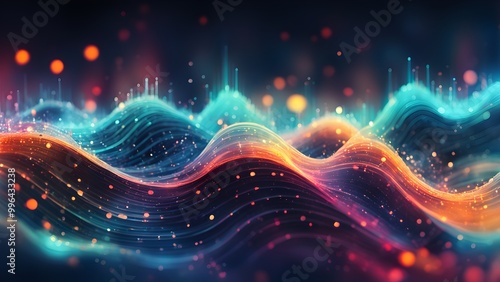 Abstract background with flowing lines and glowing particles in vibrant blue, orange, and red colors.