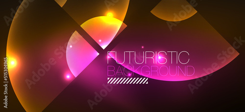 Abstract background with neon glowing light effects. Round shapes, triangles and circles. Wallpaper for concept of AI technology, blockchain, communication, 5G, science, business and technology