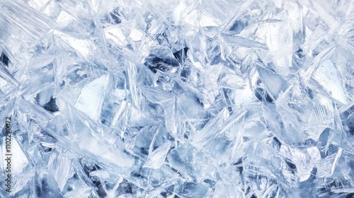 Abstract background with sharp, jagged ice-like shards in translucent white and frosty blue tones. The fractured textures evoke a dynamic, frozen landscape with crystal clarity.