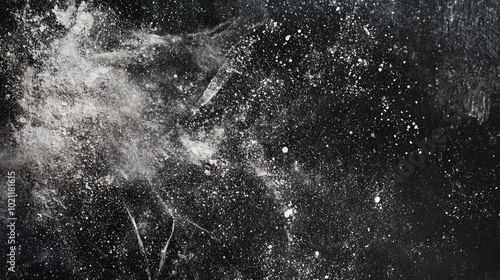 Abstract black and white texture with flour-like splashes, creating a dynamic and artistic background.