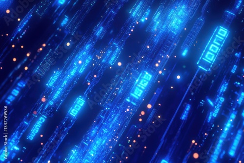 Abstract blue digital data streams with orange particles on a dark blue background forming a grid