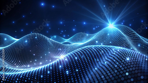 digital artwork, abstract, waveform, particle, flowing, landscape, dark background, bright light, blue, glowing, dot, line, curve, wave, motion, energy, technology, futuristic, science fiction, space, cosmos, night sky, star, bokeh, aglow, vibrant, dynamic, elegant, seamless, texture, pattern, background, wallpaper, website, banner, graphic design, illustration, digital illustration, computer graphic, artwork, art, design, visual, image, picture, photo