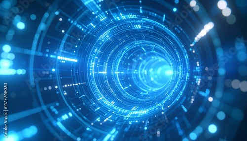 Abstract blue glowing spiral tunnel. Futuristic digital technology background.