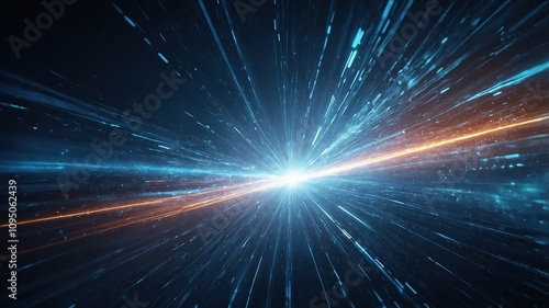 Abstract blue light speed background with laser rays and glowing flare in the center, motion blur effect, futuristic design concept for technology or science illustration