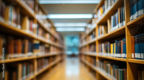 Abstract blurred interior of public library with bookshelves, defocused effect for business or education background