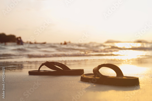 Abstract brown shoes on beach and sand with sunset background, vacation and holiday concept, with copy space