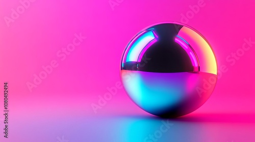 Abstract chrome sphere, backlit with neon colors, reflective surface creating dynamic effect